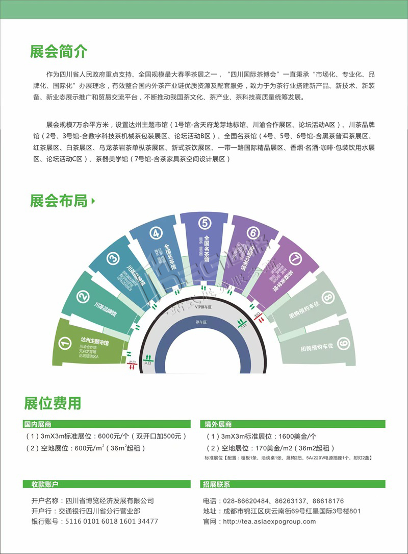 本屆展會(huì)7萬余平方米,設(shè)置有達(dá)州主題市館(1號(hào)館-含天府龍芽地標(biāo)館、川渝合作展區(qū)、論壇活動(dòng)A區(qū))、川茶品牌館(2號(hào)、3號(hào)館-含數(shù)字科技茶機(jī)械茶包裝展區(qū)、論壇活動(dòng)B區(qū))、全國名茶館(4號(hào)、5號(hào)、6號(hào)館-含黑茶普洱茶展區(qū)、紅茶展區(qū)、白茶展區(qū)、烏龍茶巖茶單樅茶展區(qū)、新式茶飲展區(qū)、一帶一路國際精品展區(qū)、香煙·名酒·咖啡·包裝飲用水展區(qū)、論壇活動(dòng)C區(qū))、茶器美學(xué)館(7號(hào)館-含茶家具茶空間設(shè)計(jì)展區(qū))